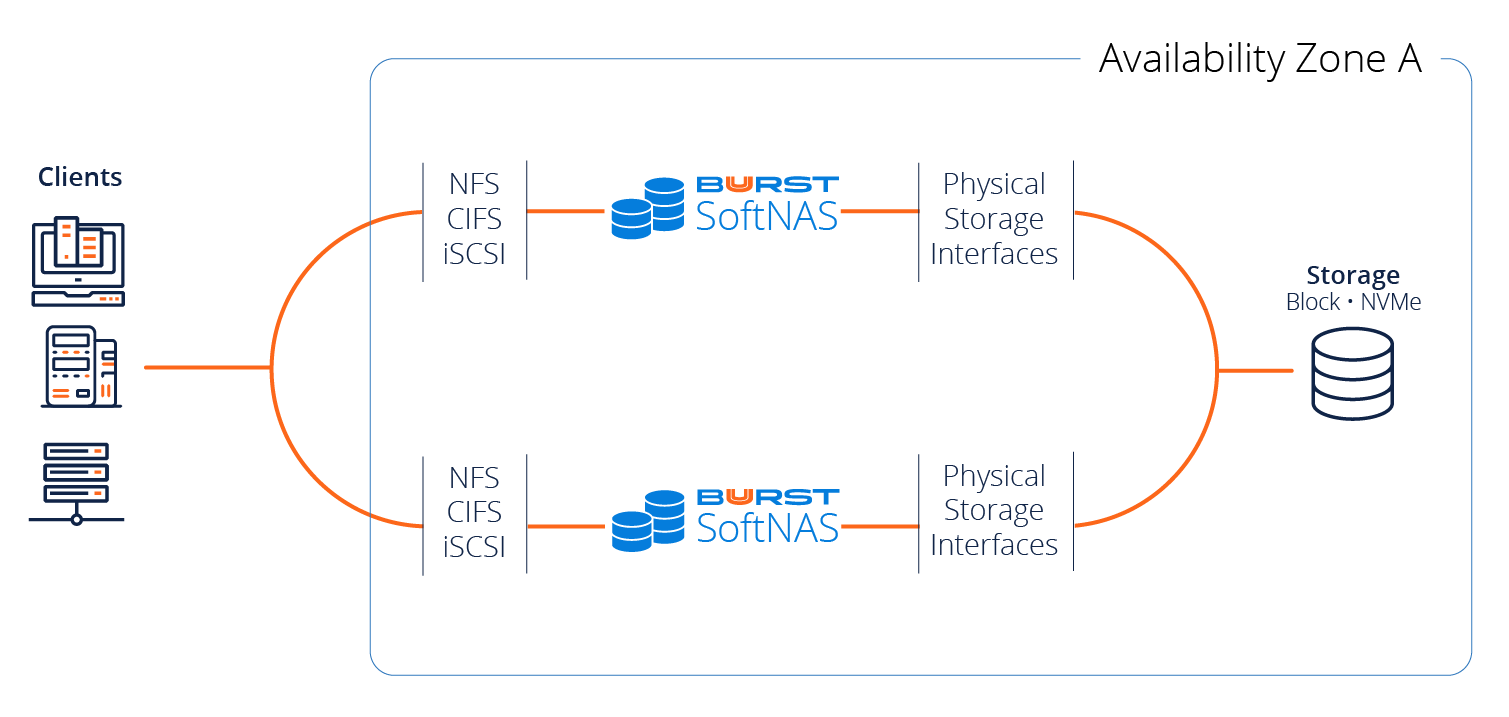 Buurst SoftNAS offers a highly available architecture from a storage perspective, leveraging our SNAP HA capability, allowing us to provide high availability across multiple availability zones. SNAP HA offers 99.999% HA with two SoftNAS controllers replicating the data into block storage in both availability zones. Buurst customers who run in this environment qualify for our Buurst No Downtime Guarantee.