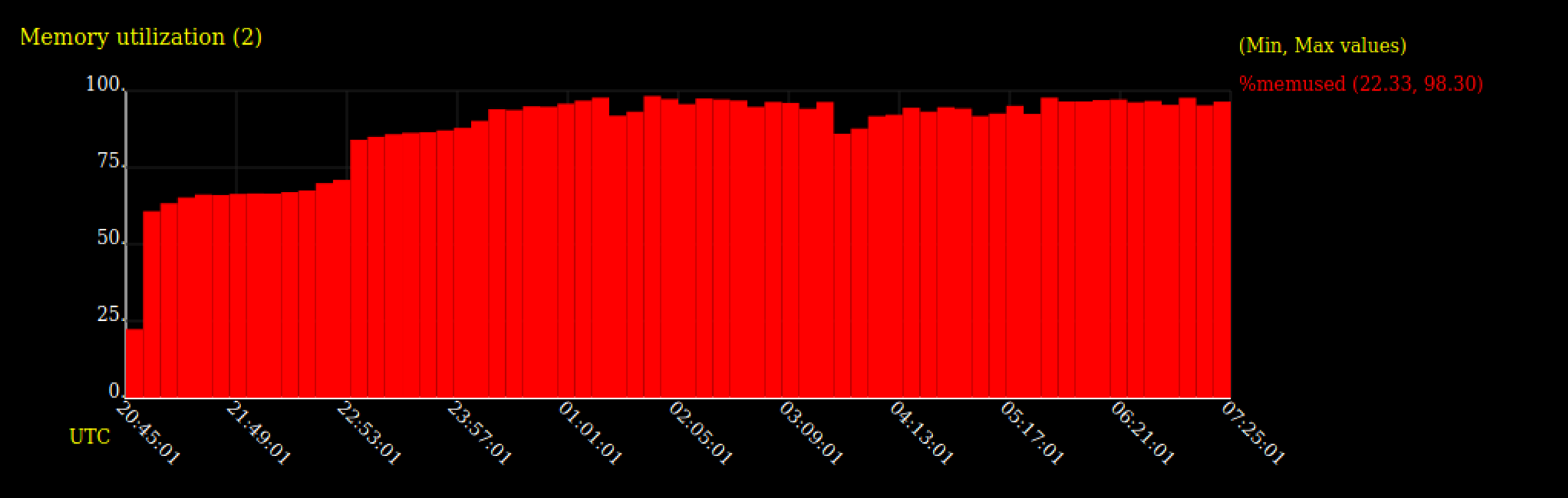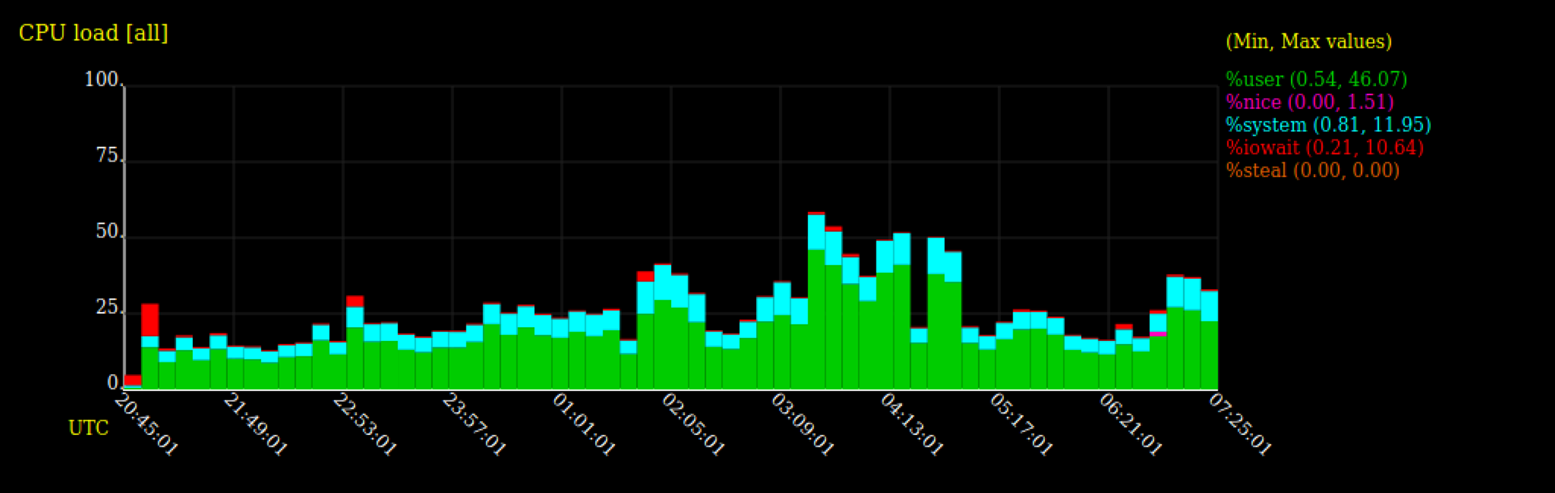 07:20:01 all 1.07 0.00 3.56 89.42 0.00 5.95This is actually a good example that shows some event possibly requiring further investigation. The server was clearly stuck on IO subsystem as the %iowait column shows it was more than 99%. At 05:50 it suddenly became better, iowait dropped to nearly zero and overall CPU usage was less than 0.5%. Surely something was going on!
