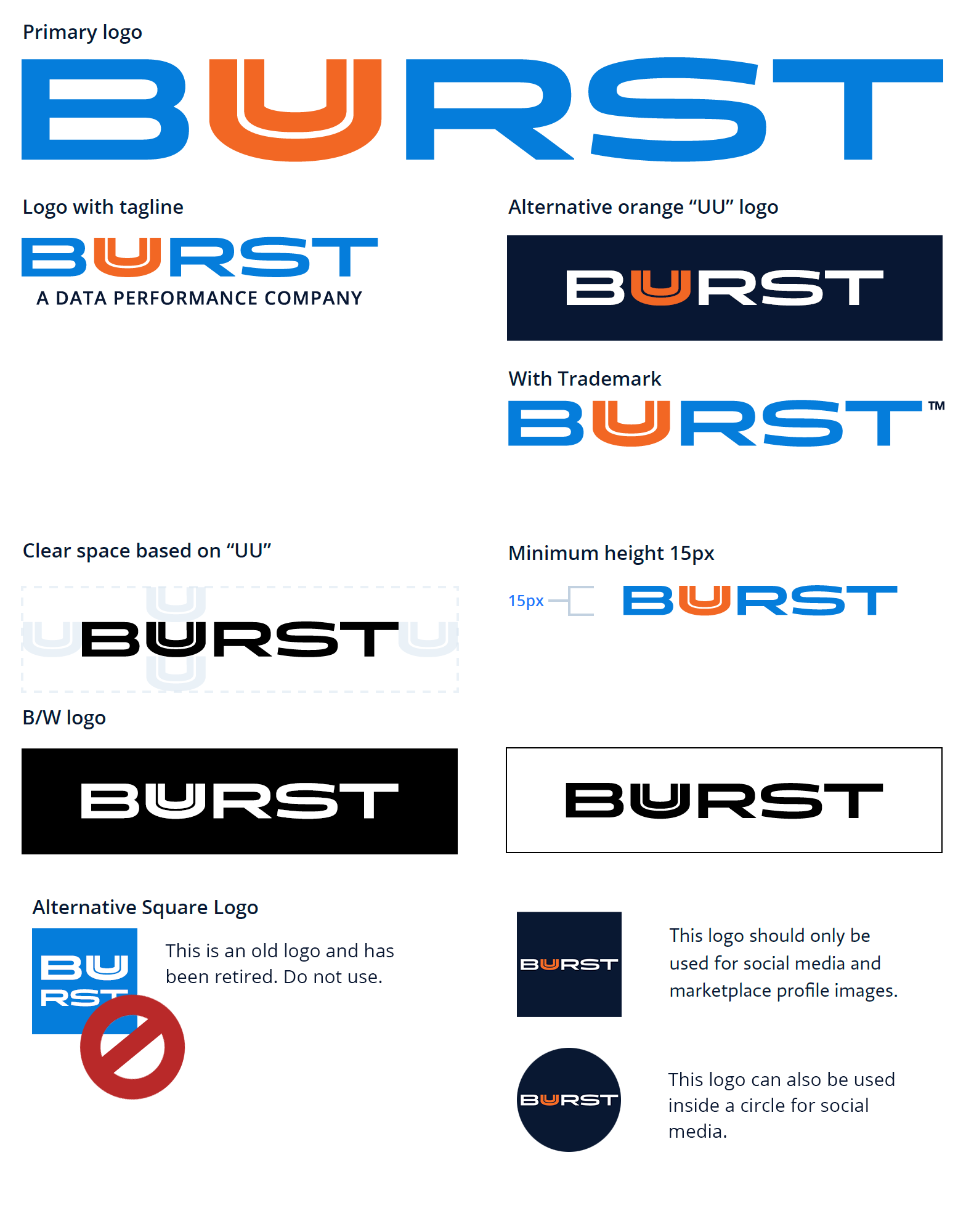 The Buurst logo is a representation of the energy and trust our brand provides. The primary logo should always be the default logo. The logo was designed in a way to scale up and down so that the “UU” treatment is legible. The lowest recommended logo height is 15px. Legibility should always be considered when placing the logo. To the right are acceptable alternative uses and guidance on clear space.