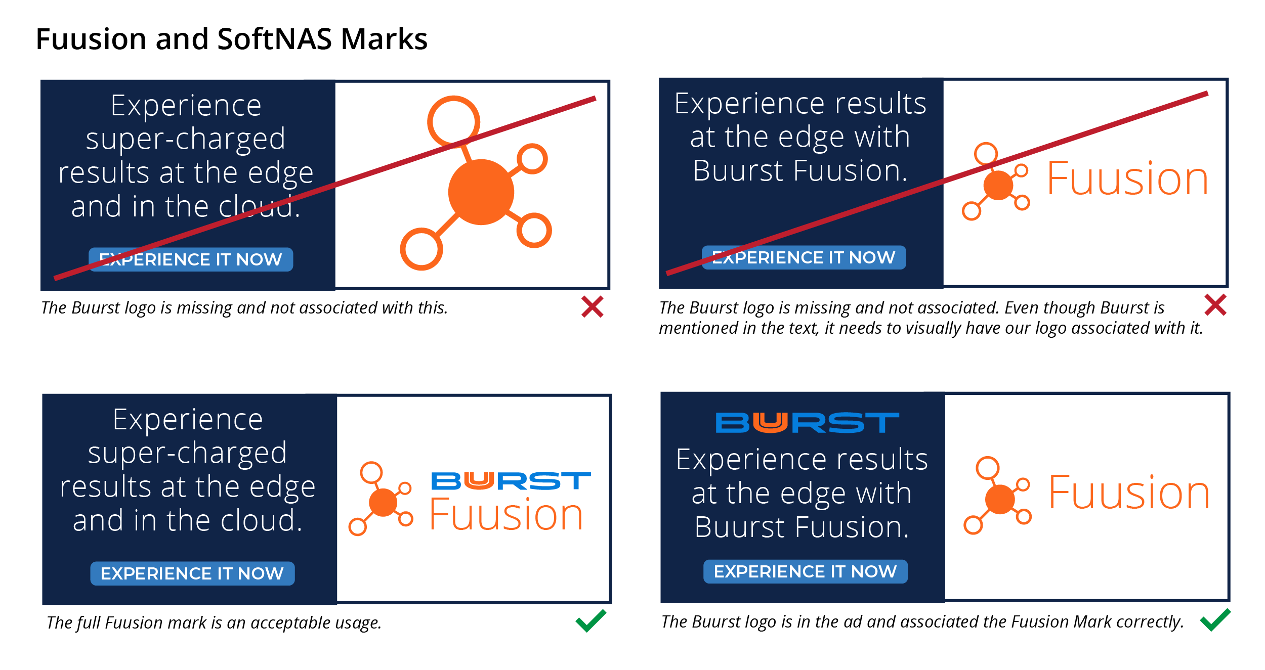 The version of the Secondary marks without the Buurst logo should only be used in decks, ads, or situations where the buurst logo is also on the page AND it is clear that either Fuusion or SoftNAS are being referenced.