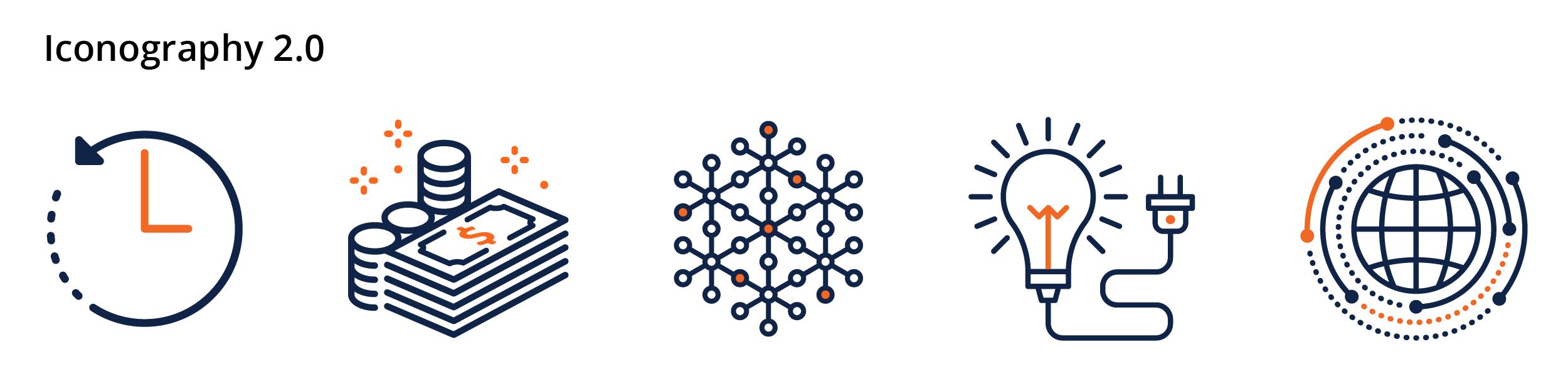 Our iconography is clean, bold and stark. The iconography should provide a balance against the other elements within the brand. Black and white can be used on iconography when needed. Orange can be used as an accent.