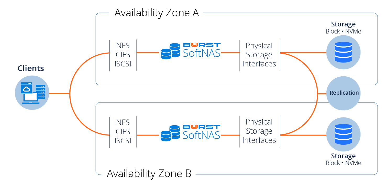 Buurst’s SoftNAS Snap HA is for customers who need 5-9’s availability. SNAP HA uses SnapReplicate™ to replicate data from a primary node to the secondary node in an HA pair. Snap HA uses a virtual IP (VIP) address to ensure clients maintain connectivity to the NAS data after failover.
